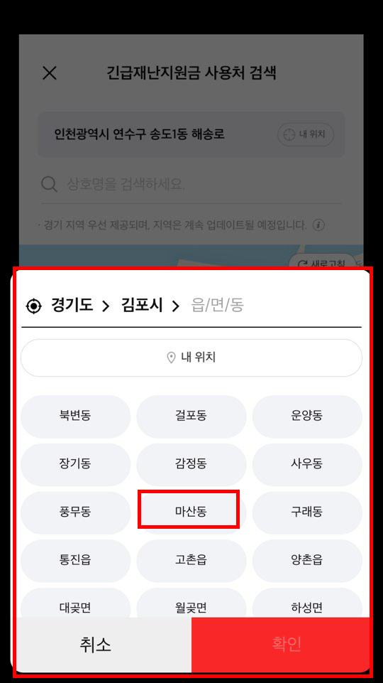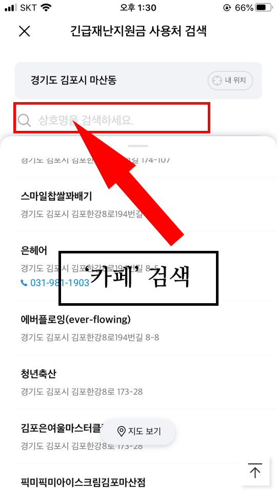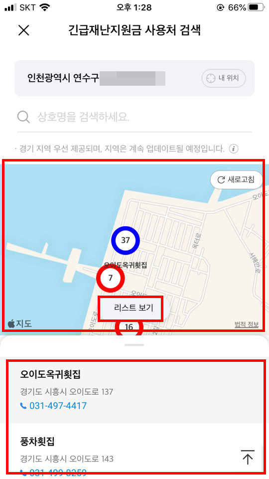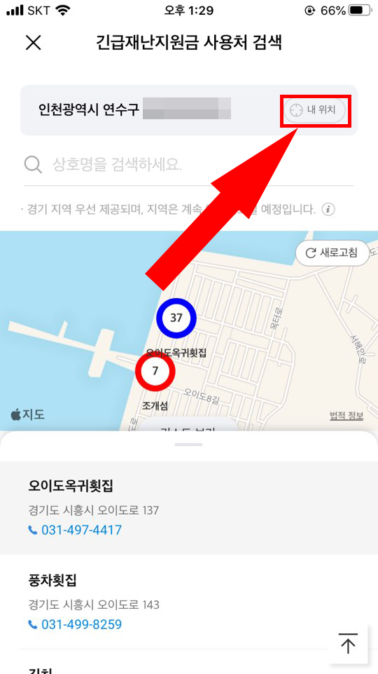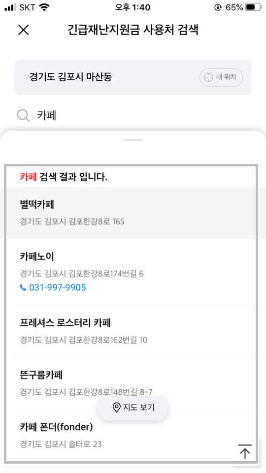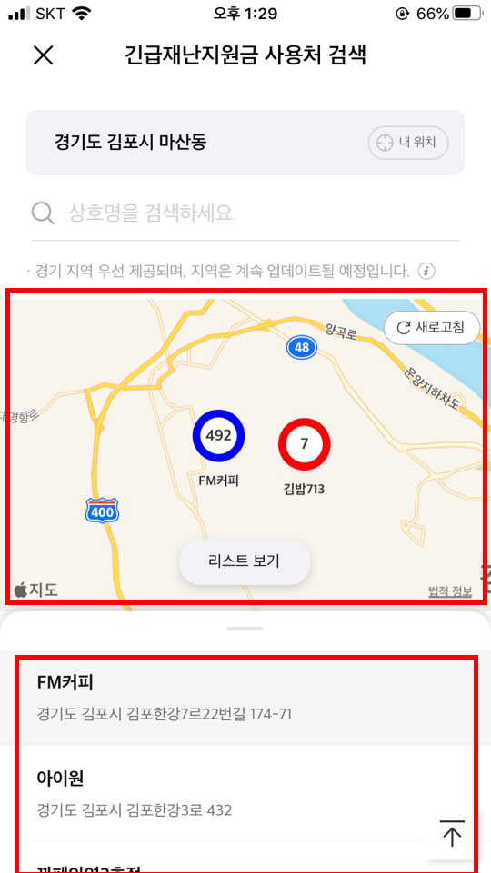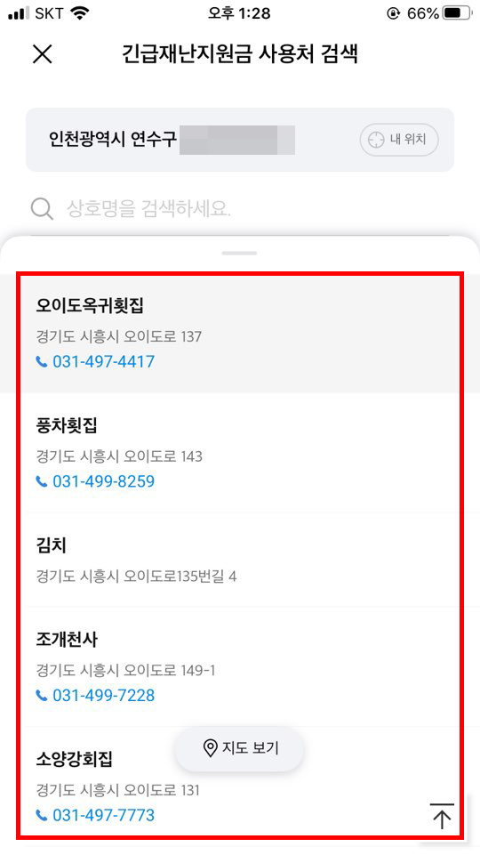 내 위치와 가까운 지역의 사용처 정보가 화면에 나타납니다.
