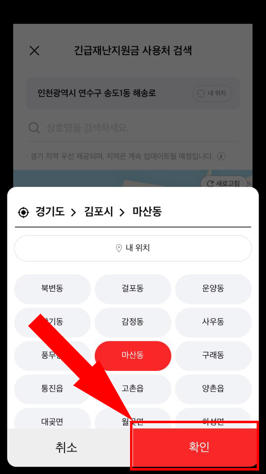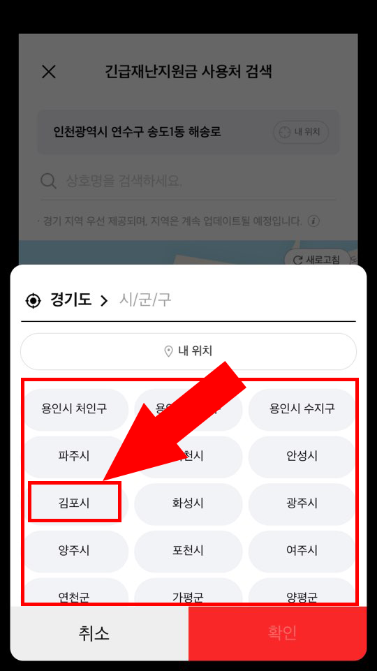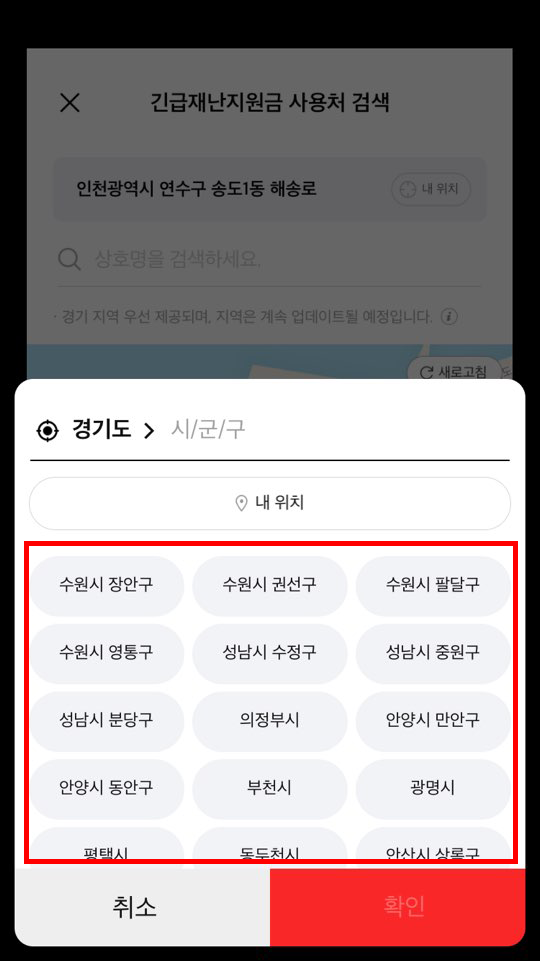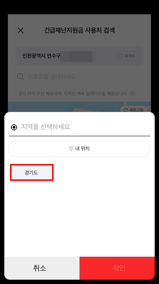 경기지역 재난지원금 사용처를 클릭하는 화면이 나타납니다.