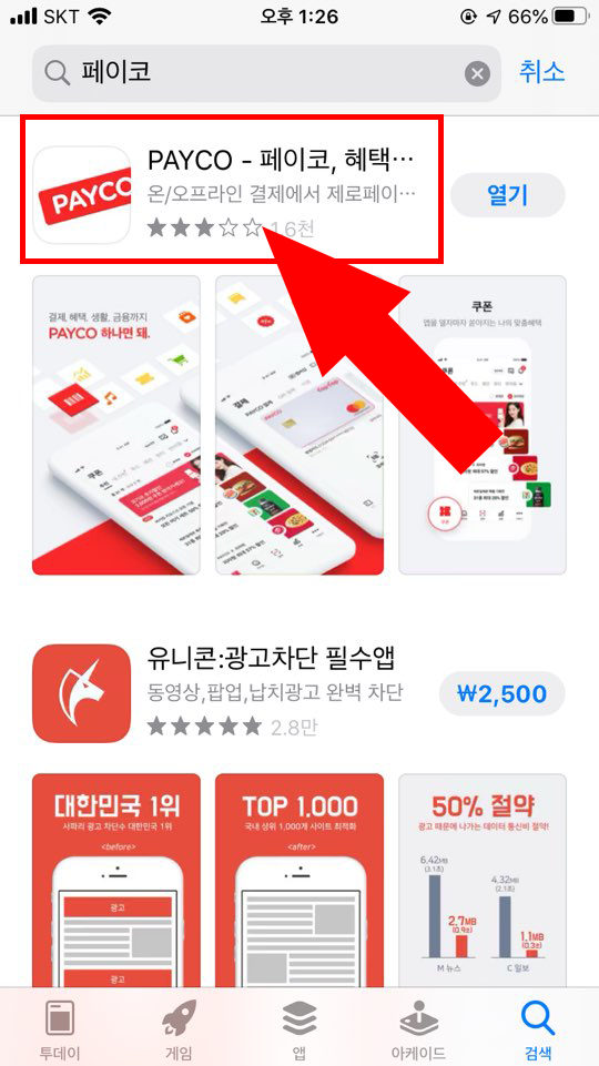 제가 빨간 화살표로 가리킨 앱이 페이코입니다!